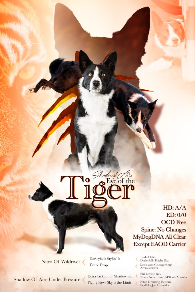 Tiger also got a stunning stud dog poster created by Slovenian graphic designer Eva Kastelic! I absolutely love it. It takes a special talent to make an image speak, and I think this one captures Tiger perfectly—bright, happy, handsome, with excellent structure—and, of course, having the Eye of the Tiger when it comes to agility.